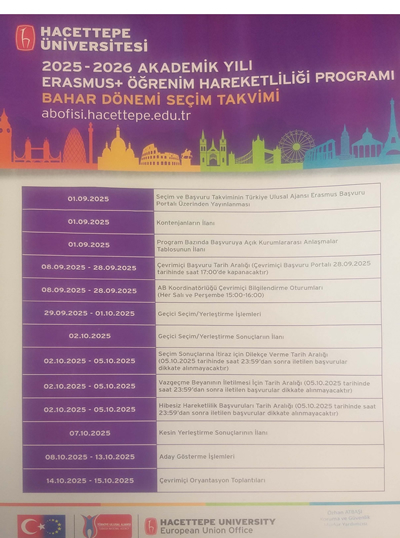 Hacettepe Üniversitesi 2025-2026 Akademik Yılı Erasmus + Öğrenim Hareketliliği Programı Bahar Dönemi Seçim Takvimi aşağıda yer almaktadır.