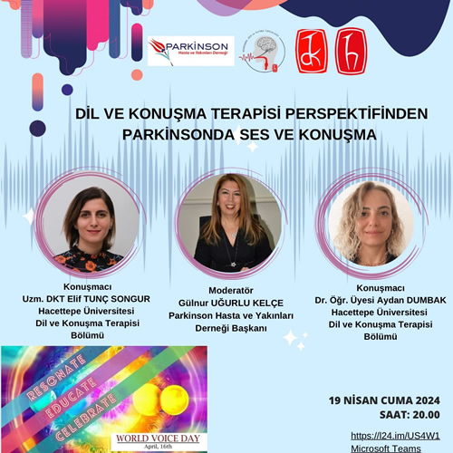 Dünya Ses Günü kapsamında 19.04.2024 tarihinde yapılacak olan DİL VE KONUŞMA TERAPİSİ PERSPEKTİFİNDEN PARKİNSONDA SES VE KONUŞMA adlı etkinliğimiz The Voice Foundation'da paylaşılmıştır (https://worldvoiceday.org/entry/214/).