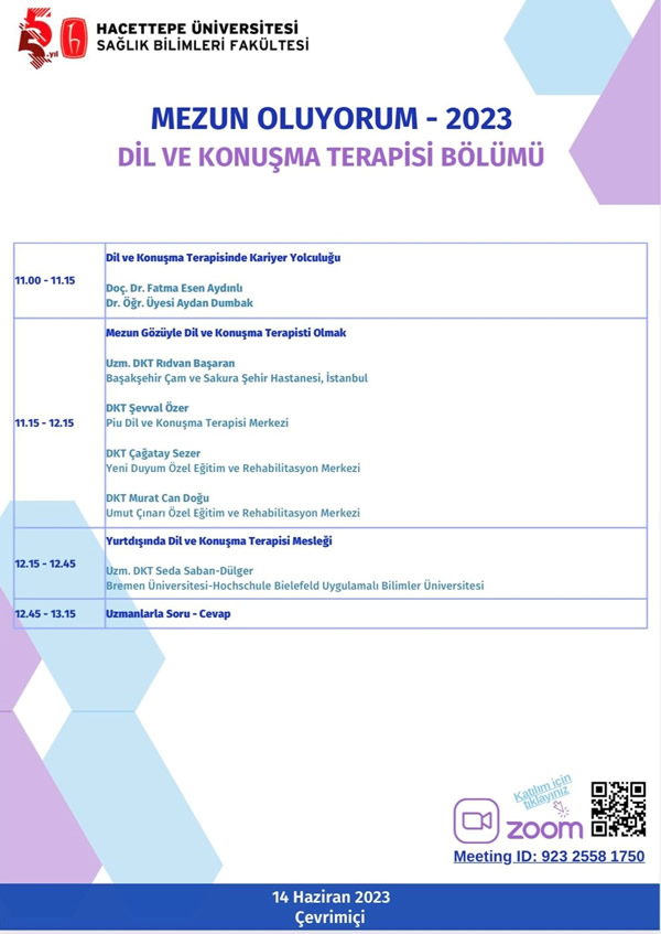 Hacettepe Üniversitesi Sağlık Bilimleri Fakültesi Dil ve Konuşma Terapisi Bölümünde öğrenimine başlayacak olan öğrencilerimiz için hazırlanan Üni101 Üniversite Yaşamına Giriş dersi kapsamında bölüm tanıtım etkinliğimiz tüm bölüm öğretim elemanlarının katılımı ile Dr. Öğretim Üyesi Ayşın Noyan Erbaş sorumluluğunda 28 Eylül 2022 tarihinde saat 14.00'te Prof.Dr.Soner Özkan Amfisinde(D Blok Alt kat) gerçekleşecektir.